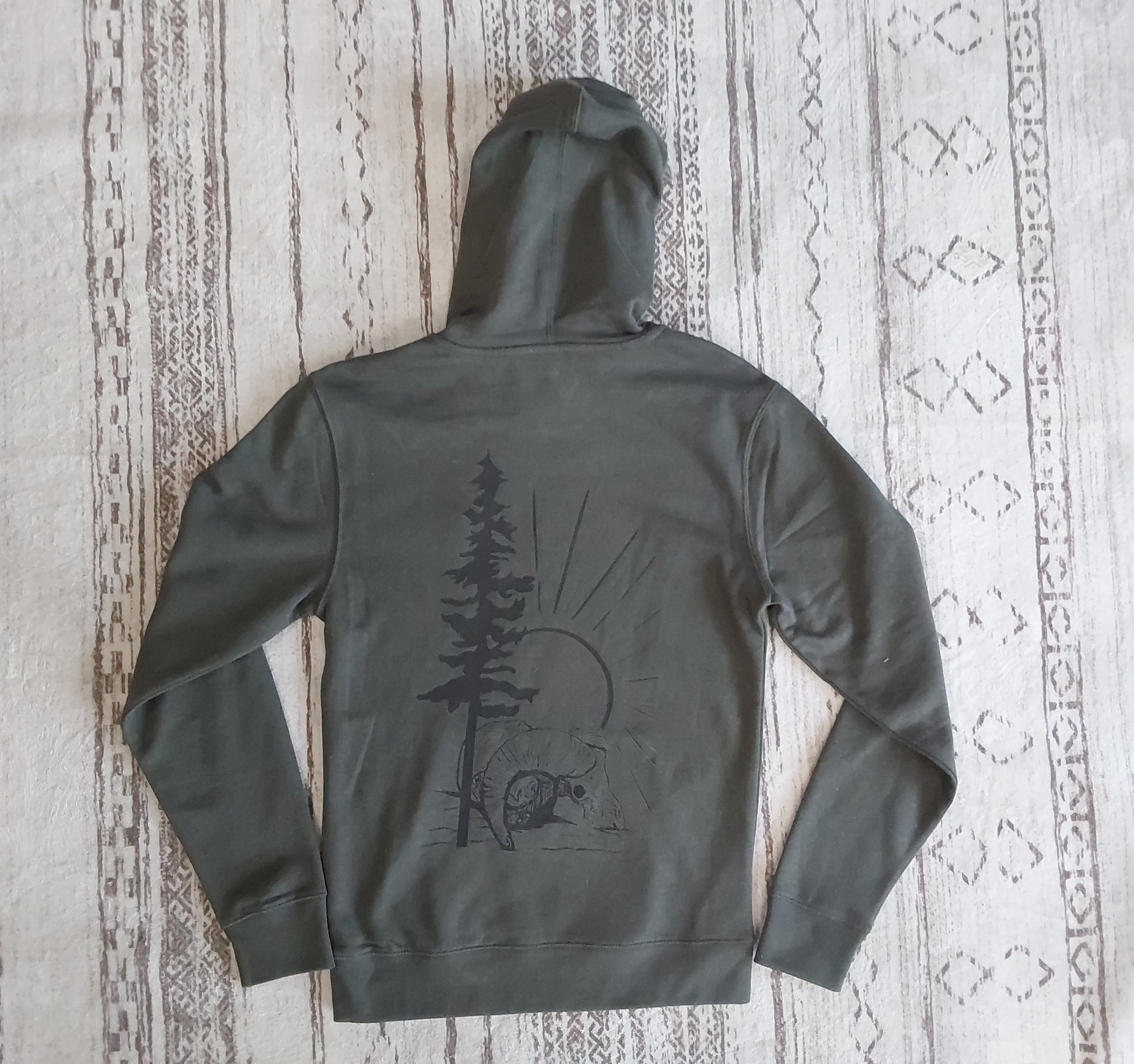 Stay cozy while embracing your adventurous spirit with our Forever Wild Hoodie. This hoodie features bold "FOREVER WILD" lettering on the front and a striking nature inspired graphic on the back, complete with a pine tree, ram skull and a radiant sun for a rugged, free spirit vibe.